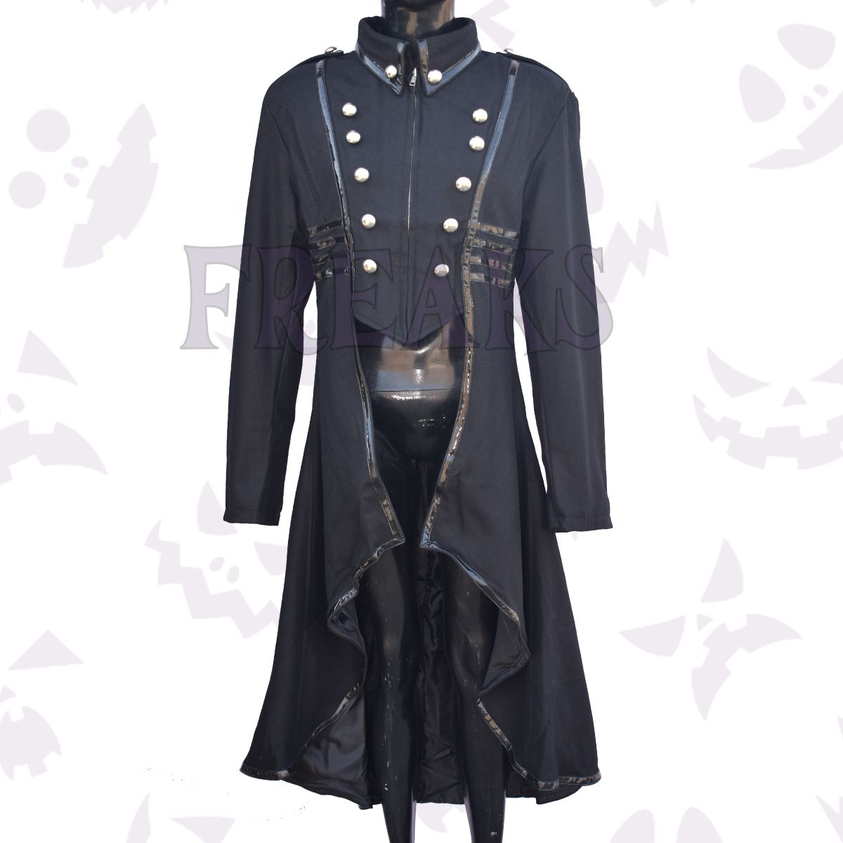 Command a majestic and formidable presence with Freaks' Gothic Empress Double-Breasted Tailcoat. This exquisite black long coat crafted from wool bend fabric is a true masterpiece of gothic and military-inspired design, perfect for making an unforgettable entrance. It features a bold full-front zipper closure complemented by a dramatic double-breasted aesthetic with two rows of gleaming silver buttons. Striking PVC trim details the high stand-up collar, front panels, and flaring hem, adding a sleek, dark contrast. The elegant tailcoat silhouette, tapering dramatically at the back, ensures a commanding and distinguished presence. Ideal for gothic balls, vampire cosplay, Steampunk events, or any grand occasion where you wish to embody powerful sophistication and undeniable allure.