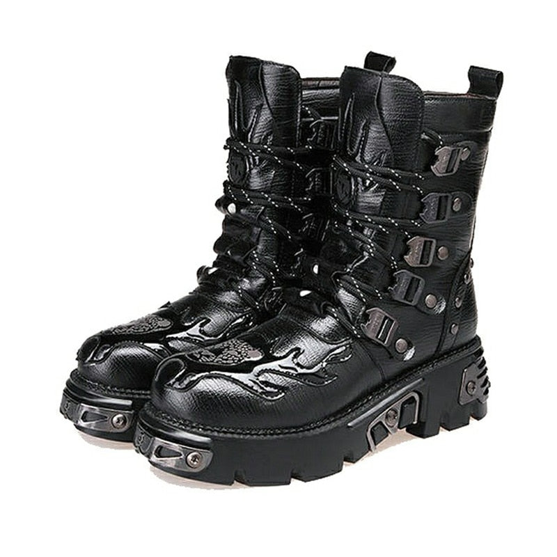 Unleash your formidable edge with Freaks' Punk Men's Motorcycle Leather Boots. These commanding black military-style boots are a true statement in alternative footwear, blending rugged power with bold design. Crafted from high-quality leather, they feature striking embossed flame detailing on the toe, an intricate system of multi-buckle straps, and gleaming metal accents along the sides and toe caps. The chunky lugged platform soles provide commanding height and exceptional grip. With a traditional lace-up front and a convenient side zipper, these motorcycle boots offer both secure fit and undeniable attitude. Perfect for punk concerts, gothic gatherings, industrial raves, or dominating any street in style.